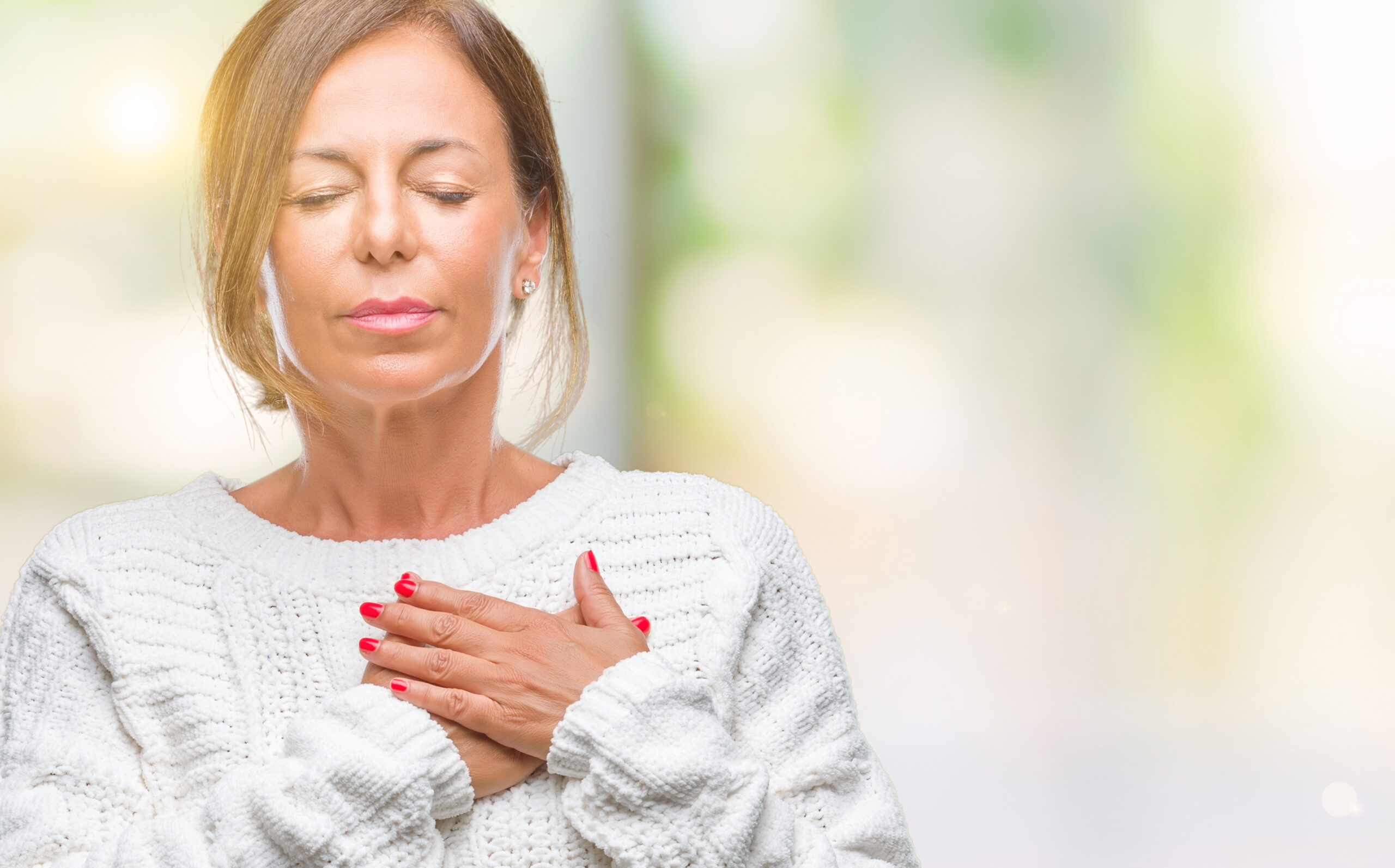 Leg je handen op je hart of op een plek waar je spanning voelt. Stel je voor dat je handen zachtheid en warmte geven aan deze plek, zoals een warme deken.